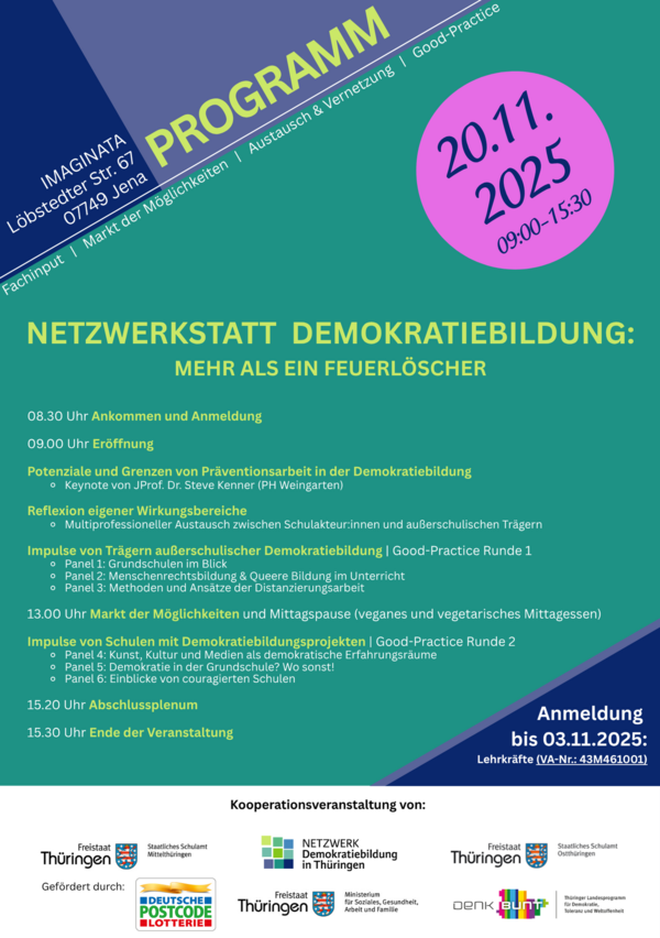 Die Veranstaltung ist eine Kooperation der Staatlichen Schulämter Mittelthüringen und Ostthüringen, dem VereinT Zukunft Bilden e.V. und dem Netzwerk Demokratiebildung in Thüringen.